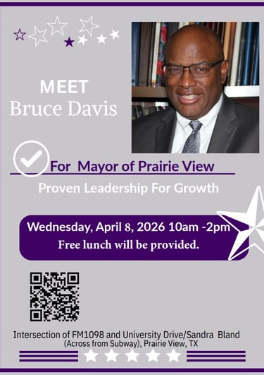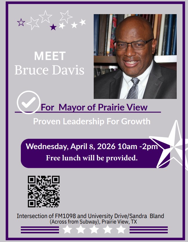 Support Bruce Davis’s campaign for Mayor of Prairie View. Bruce is committed to building our own wastewater capacity, replacing and expanding drinking water infrastructure, improving streets, and dramatically strengthening the city’s relationship with Prairie View A&M University.